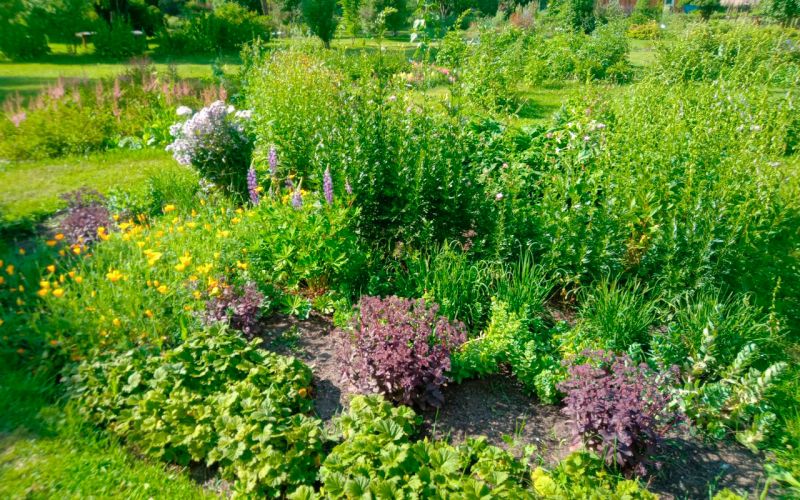 В экспозициях много лекарственных, пряных трав. А вот и луковая клумба. Для каждого вида отдельная секция. Но вот таблички есть не везде. Растения стоят мощные. Некоторые виды уже отцвели (шнитт, косой, Шуберта), некоторые в процессе (голубой, алтайский), некоторые только готовятся (слизун, душистый).