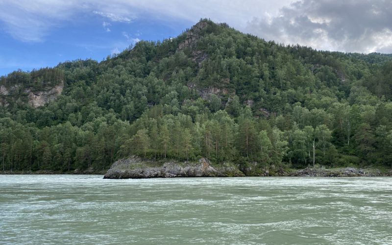 Начинается дождь, сначала мелкий, затем усиливается, хотя между облаков временами проглядывает солнце. Оно уже клонится к закату. В его косых лучах лес выглядит просто сказочным. Капельки дождя, словно жемчуг, рассыпаются по траве. Одежда, обувь, все промокло (как всегда дождевик забыла на стоянке). Но этого не замечаешь, это мелкие детали в сравнении с тем, какие великолепные виды начинают открываться перед тобой. Красавица Катунь петляет между гор и уходит вдаль своими бурлящими водами. Березы и сосны с необычными формами. Лесная подстилка настолько мягкая, что ноги идут словно по пружинам.