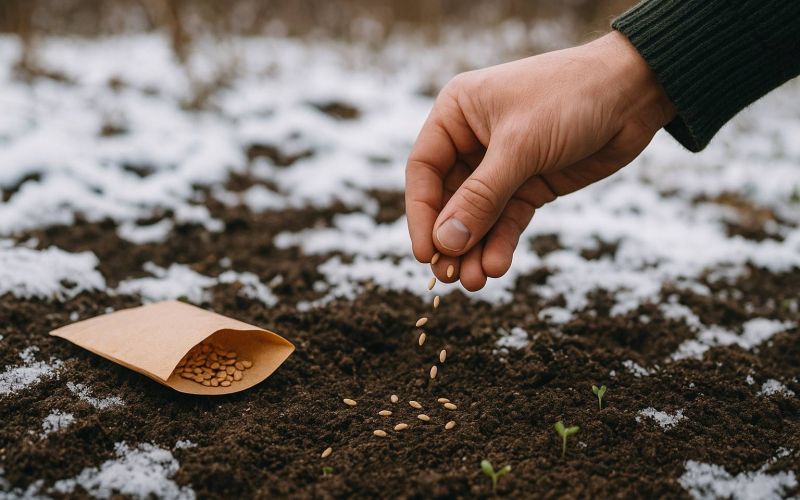 Существует также способ, при котором семена раскладывают в борозды и присыпают снегом. Он подходит особенно для культур с хорошей способностью к самопосеву, таких как укроп, щавель и ревень. С таянием снега семена самостоятельно окажутся в почве и успешно прорастут, что упрощает подготовку грядок и экономит усилия огородника.