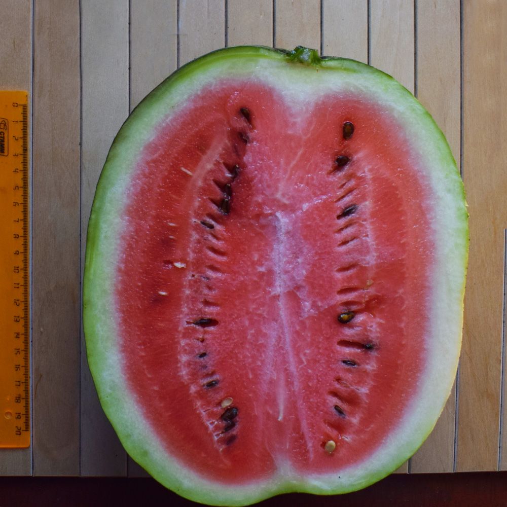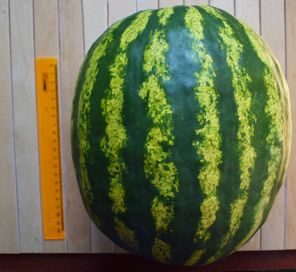 Осторожно! Опасен для здоровья человека! Можно надорвать спину, перенося урожай с огорода в подвал! Плоды вырастают до 18 кг, а среднестатистические до 9 кг. Скороспелый, сверхурожайный гибрид для выращивания в открытом грунте и под временными плёночными укрытиями. Плоды округло-овальные, ярко-зелёные, с более тёмными полосами. Мякоть ярко-красная, нежная, зернистая, очень сладкая и ароматная.