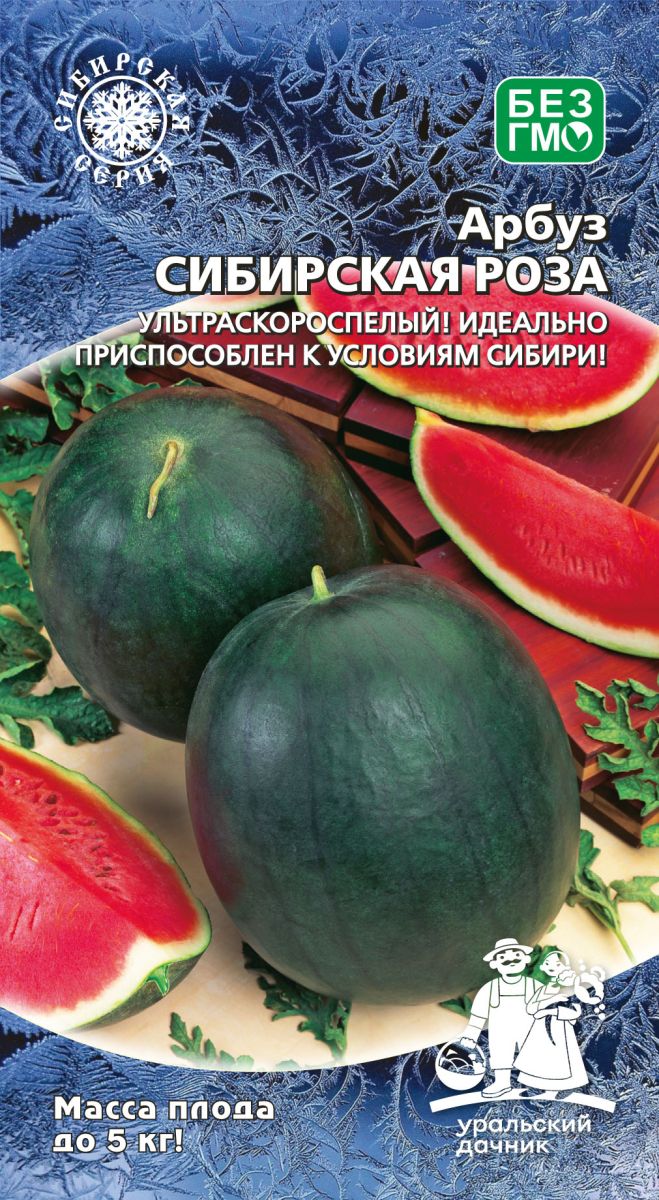 Ультраскороспелый и неприхотливый! Идеально приспособлен к условиям Сибири! Вынослив в жару и холод! Плоды до 5 кг, с сочной, сахаристой мякотью. Ценность сорта: отличные вкусовые качества, устойчивость к пониженным температурам и неблагоприятным условиям выращивания. Дружное формирование раннего урожая, хорошая лежкость плодов. Вынослив к фузариозу и антракнозу.