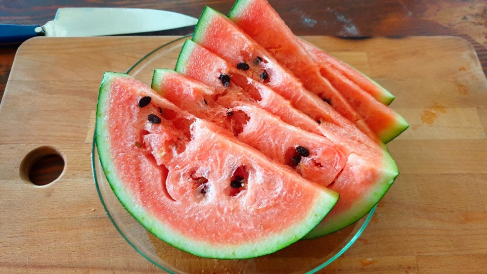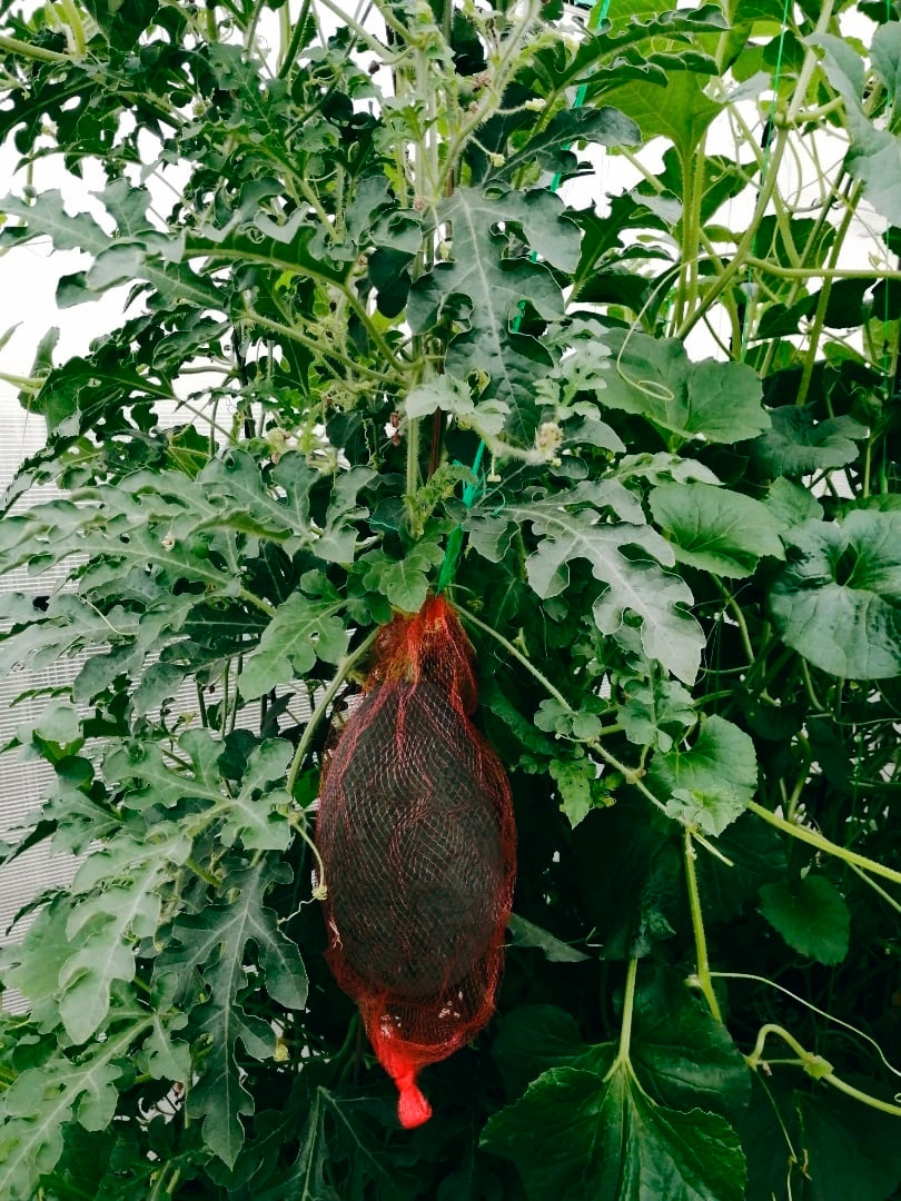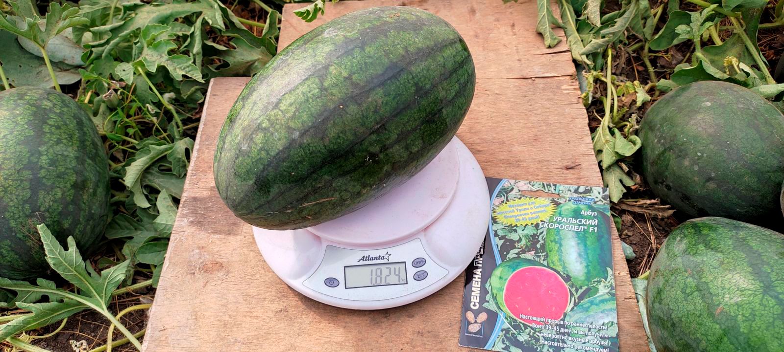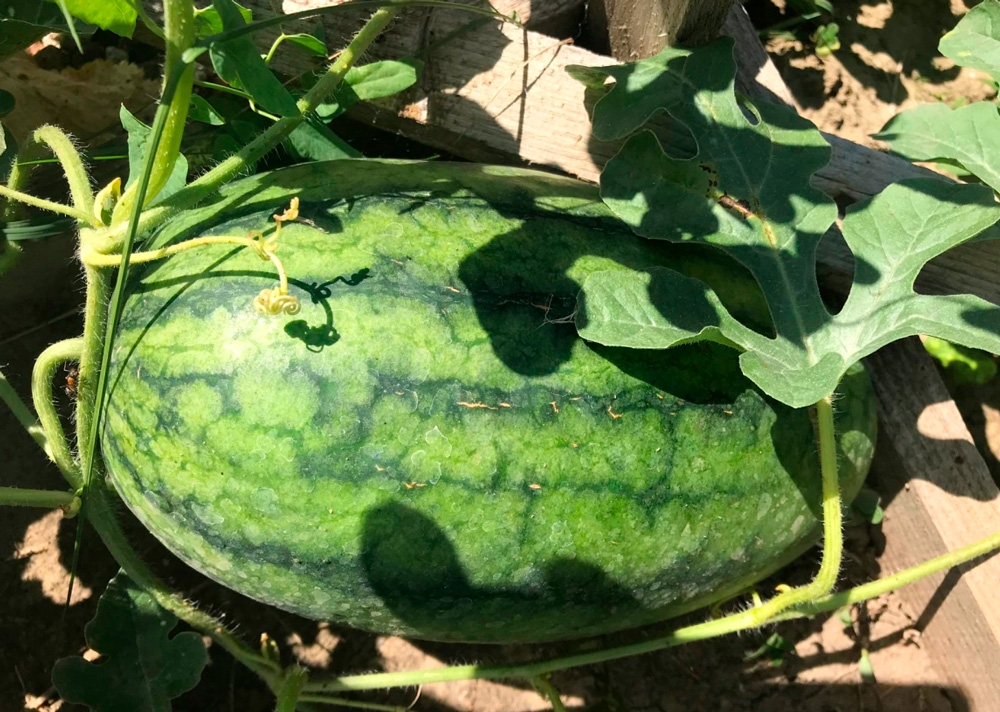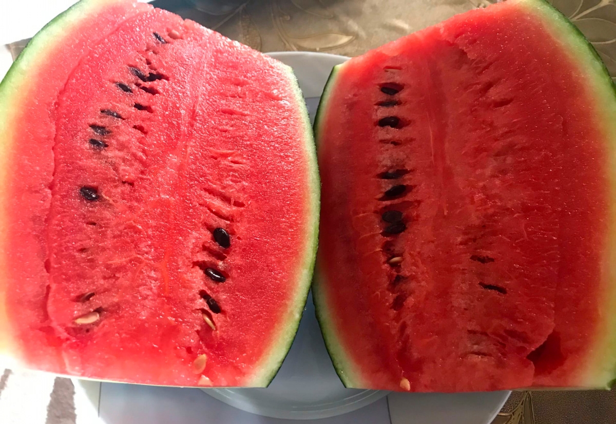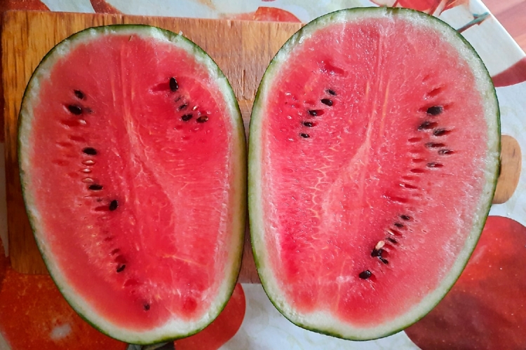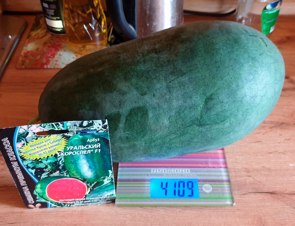 Гибрид невероятно раннего срока созревания, от всходов до первых плодов всего 39-45 дней. Образует крайне интересные мини-плоды: от овальной до слегка удлинённой формы. Средняя масса около 1-1,2 кг, но некоторые ягоды достигают 2-х и более кг. Окраска слегка полосатая, у некоторых плодов более темная. Кора очень тонкая. Мякоть рубиново-красная, очень сочная, необычайно приятно хрустящая, искрящаяся сахарными зёрнами и очень сладкая. Мини плоды чрезвычайно удобны в транспортировке, и всегда свежую, освежающую ягоду можно скушать за один раз целиком!
