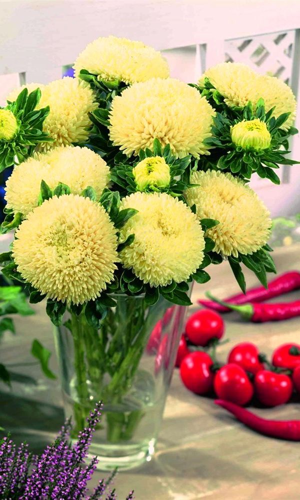 ОднолетнееОчаровательные астры серии «Балун» превосходят по плотности и махровости соцветий. Изящное растение высотой 50-60 см с густомахровыми соцветиями, устойчивыми к проникновению дождя. Соцветия плотные, шаровидные, нежно жёлтого цвета, диаметром 9-13 см, по 6-8 штук на растении. Язычковые цветки прижаты друг к другу и загнуты в середину. Растение предпочитает открытые солнечные места. Цветёт обильно с июля по октябрь. До двух недель стоят в воде, сохраняя декоративность. Прекрасно подойдут для оформления цветников и рабаток.