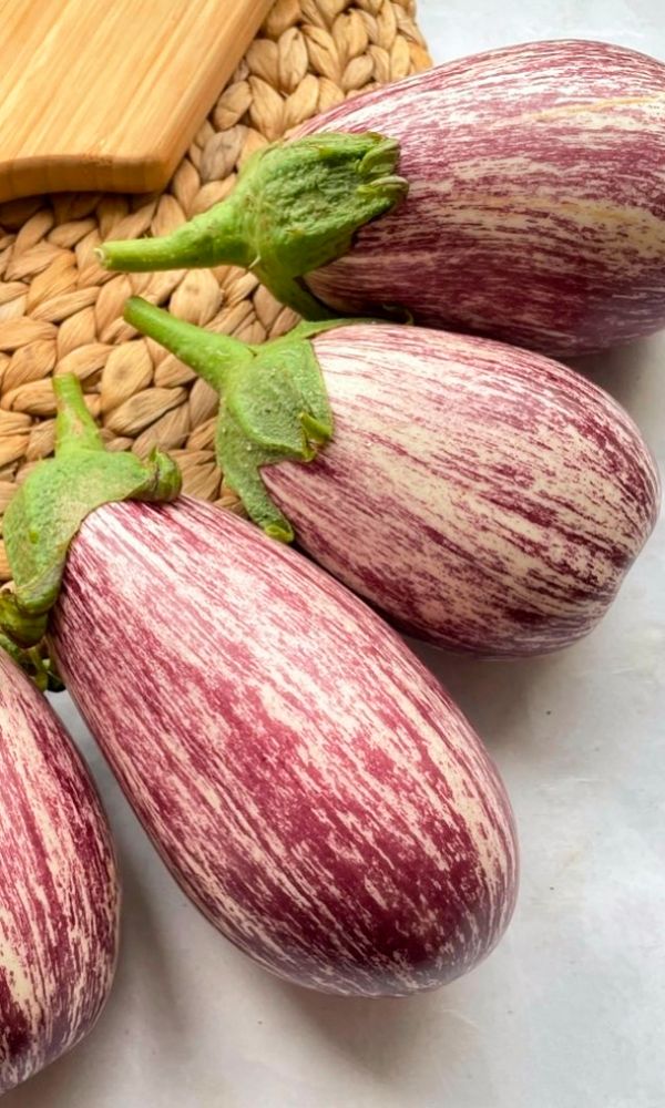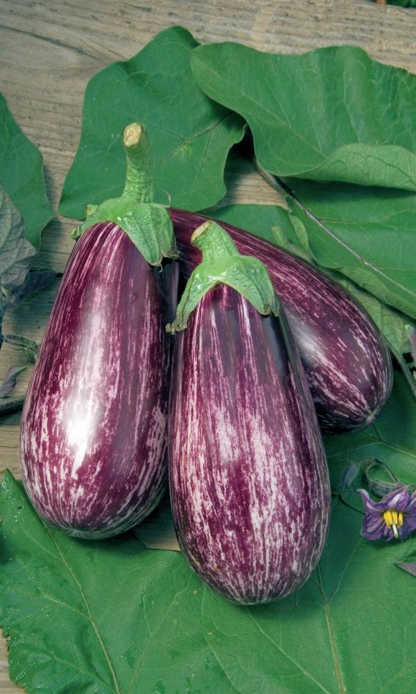 Среднеспелый сорт для открытого грунта и плёночных укрытий. Растение полураскидистое, высотой 63-75 см. Плоды овально-грушевидной формы, полосатые, с чередованием белых и ярко-выраженных розово-фиолетово-сиреневых полос, массой 250-400 г. Мякоть белоснежная, без...