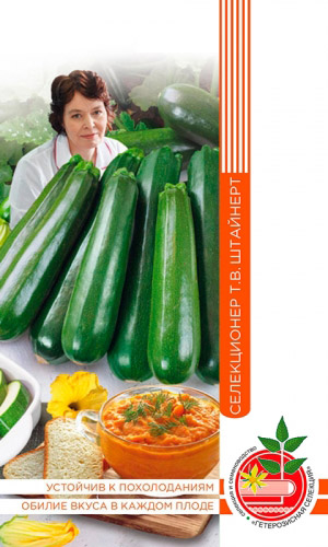 Раннеспелый, высокоурожайный сорт цукини. Начинает плодоносить на 45-50 день после всходов и отдаёт урожай до заморозков. Растения полуплетистые, формируют большое количество завязей. Плоды массой 0,7-1,3 кг. Мякоть светлая, плотная, нежная, отличного вкуса. Подходит для всех видов переработки. Плоды хорошо транспортируются и хранятся до Нового года без потери товарных качеств. Урожайность 5-6 кг/м2...