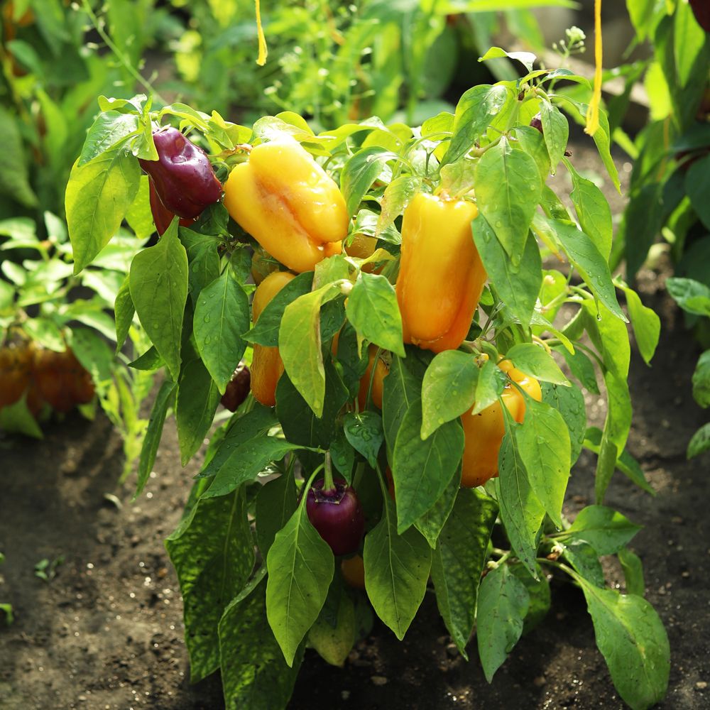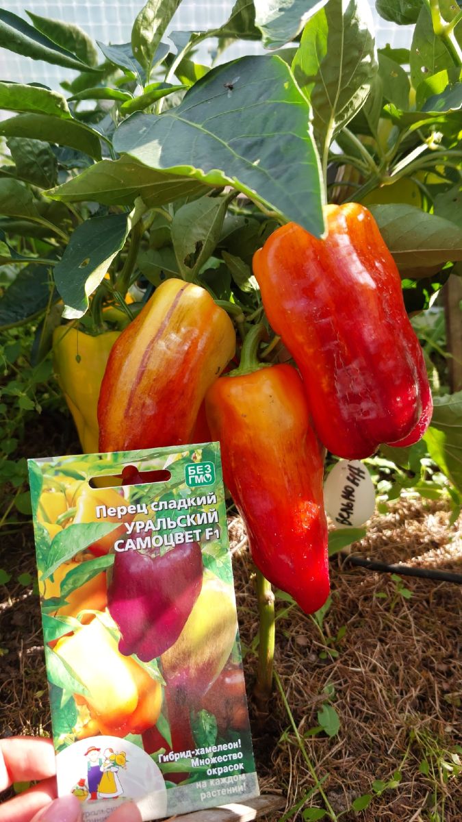 Современный среднеспелый гибрид Челябинской селекции для открытого грунта и плёночных теплиц. Растение полураскидистое, средней высоты. Плод пониклый, конусовидный, глянцевый, окраска в технической спелости фиолетовая, затем переходит в переливы жёлтого, оранжевого и красного. Число гнёзд 3. Масса плода 120 г, толщина стенки 6-8 мм. Плоды отличного вкуса. Универсальное использование.
