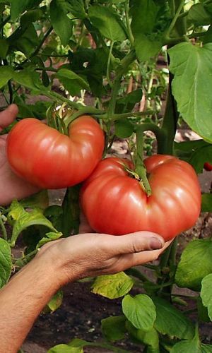 Среднеспелый крупноплодный сорт для плёночных теплиц и открытого грунта. Куст мощный, высотой 100-170 см. Плоды малиново-красные, мясистые, красивой сердцевидной формы, очень крупные, массой 400-700 г, отдельные до 1,2 кг, великолепны в салатах и заготовках на зиму. К достоинствам сорта, кроме того, относятся хорошая завязываемость плодов и достаточно высокая устойчивость к болезням. Сорт выращивают в 2 стебля...
