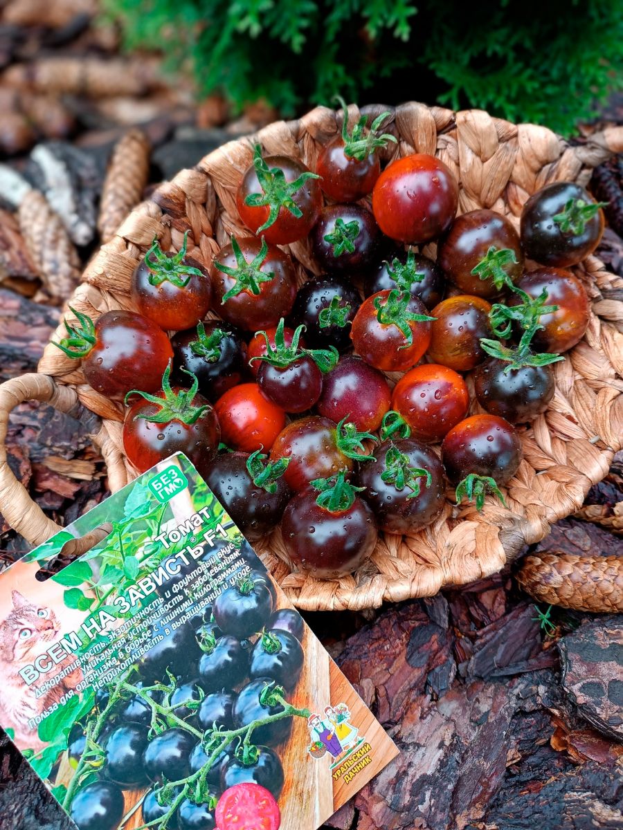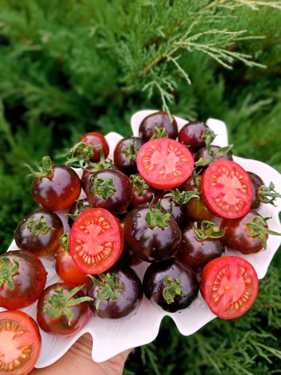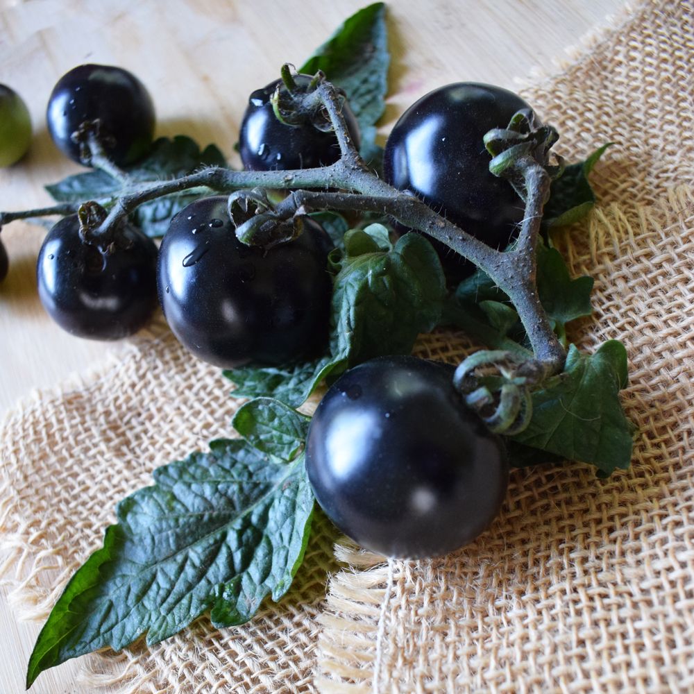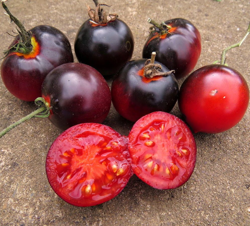Этот инновационный гибрид полученный классическим способом, без использования ГМО, по истине считают чудом в селекции томатов. Раннеспелый, индетерминантный гибрид для закрытого грунта. Кусты малолиственные, компактные и больше растут в высоту, а не в ширину, формировать стоит в 3-4 стебля. Кисть простая, состоящая из 7-10 плодов. Плоды округлые, глянцевые, массой 60-80 г, в начале формирования – зеленого окраса (как и обычные томаты), по мере вызревания он приобретает насыщенный иссиня-чёрно-фиолетовый окрас. Мякоть плотная, вишнёво-красного цвета. Плоды отличаются сильным ароматом, который чувствуется на расстоянии. У плодов отличное соотношение сахаров и кислот, что придает им особенный, необыкновенный, фруктовый вкус. Гибрид обладает отличной декоративностью и вы всегда будете иметь под рукой не только полезный и вкусный овощ, но и прекрасное и уникальное украшение вашего сада.