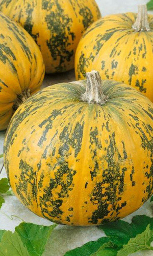 Очень урожайный, среднеранний сорт. Плоды округло-сплюснутой формы, массой 5-6 кг. Кора серая, с розовыми пятнами. Мякоть ярко-оранжевая, плотная, сладкая.Ценность: высокая урожайность, транспортабельность, хорошая лёжкость, устойчивость к мучнистой росе. Самая вкусная из крупноплодных тыкв, с рекордным содержанием сахаров и каротина, которого в плодах этого сорта больше, чем в моркови...