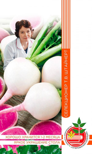 Новый, среднеспелый сорт с высокой урожайностью до 3 кг/м2. Период от всходов до начала хозяйственной годности 65 дней.Корнеплоды округлые, гладкие, выровненные, массой до 220 г. Мякоть розовая, нежная, сочная. Вкусовые качества отличные. Рекомендуется для использования в свежем виде и непродолжительного зимнего хранения.Холодостойкий сорт. Устойчив к цветушности и растрескиванию корнеплодов. Дайкон используют при простуде, для укрепления волос, при заболеваниях желчного пузыря, печени и почек...